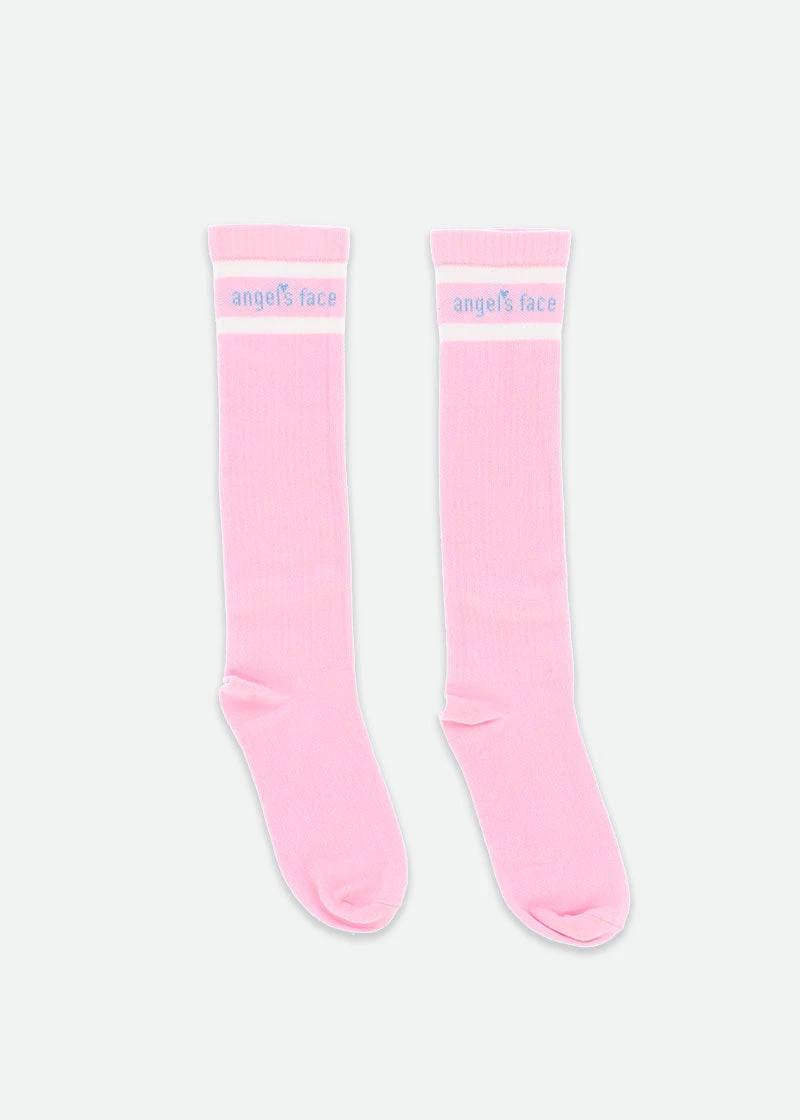 Sporty pink and blue Angel’s Face branded knee-high socks.