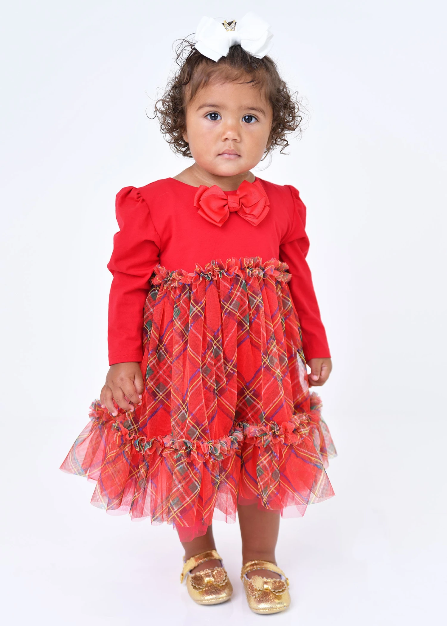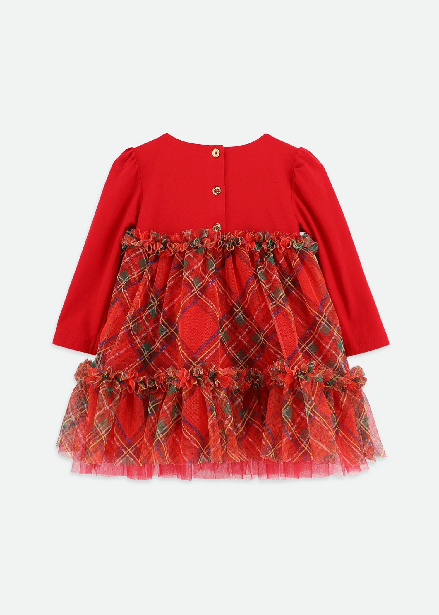 Long sleeve cotton dress with tartan tulle skirt. This dress features our signature bow at the neck and layers of soft tartan tulle on the skirt. The dress fastens at the back with gold logo buttons and is fully lined in soft cotton for comfort.