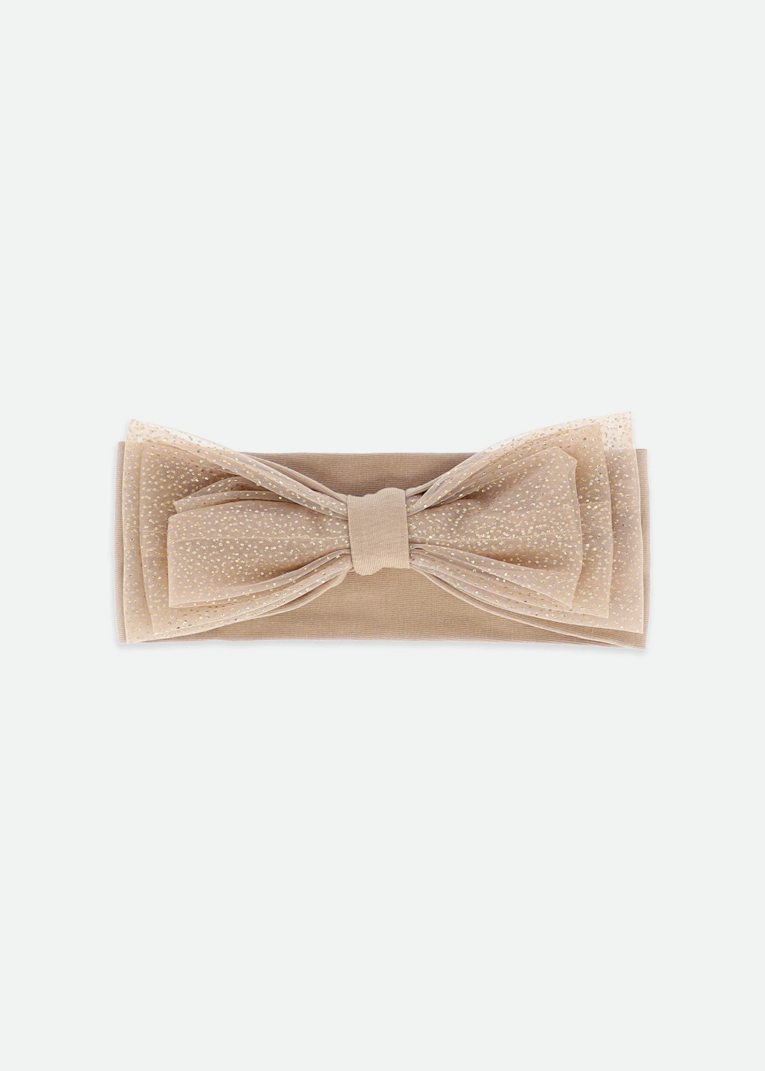 Baby girls bow headband in sand, detailed with layers of soft sparkle tulle. Headband is made from the softest stretch cotton for an easy comfortable fit.