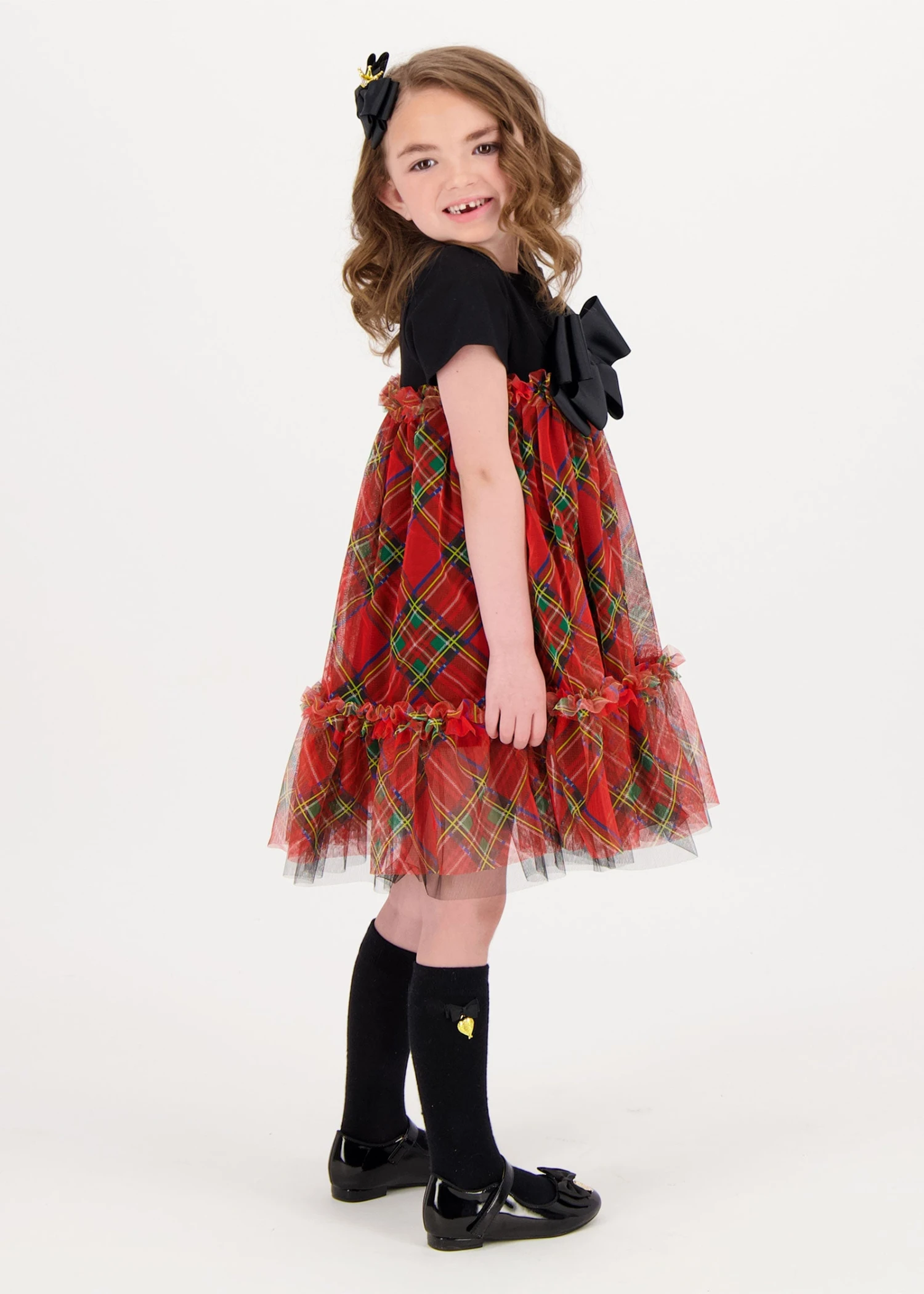 Cute black cotton dress with tartan tulle skirt. This dress features our signature bow and gold charm and layers of soft tartan tulle on the skirt. The dress fastens at the back with a gold logo button and is fully lined in soft cotton for comfort.