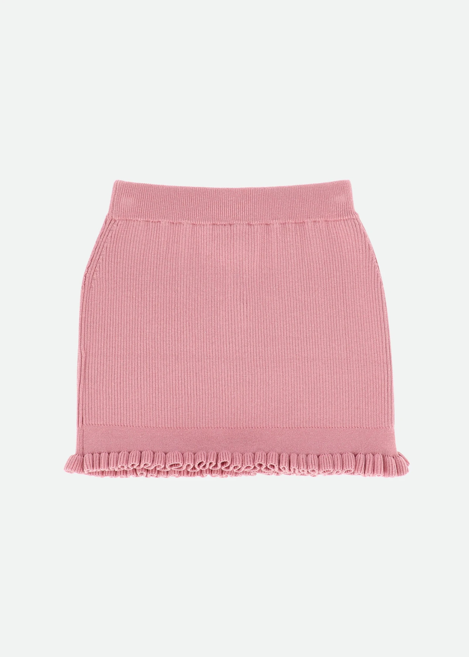 Girls Cotton Rib Knitted skirt in Tea Rose. Pairs perfectly with our Elma Jumper for a chic co-ord look. With a soft stretch elasticated waistband and is finished with our signature bow and gold heart charm on the waist.