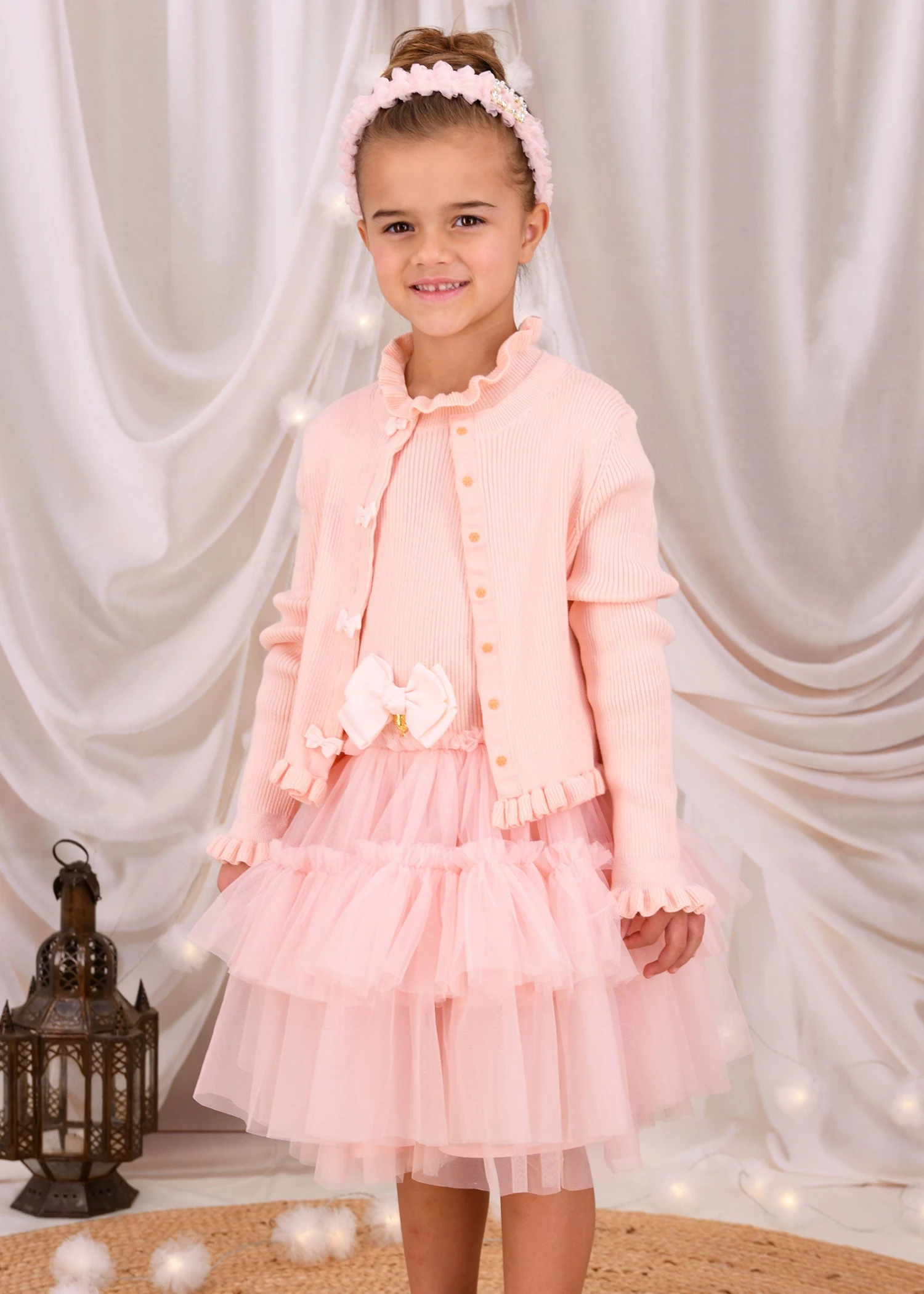 Sweet Ribbed Peach Cardigan for girls. Designed in the softest cotton knit, this cardigan is edged with a fabulous frill on the waist and cuff. Fastens at the front with cute bow press studs.