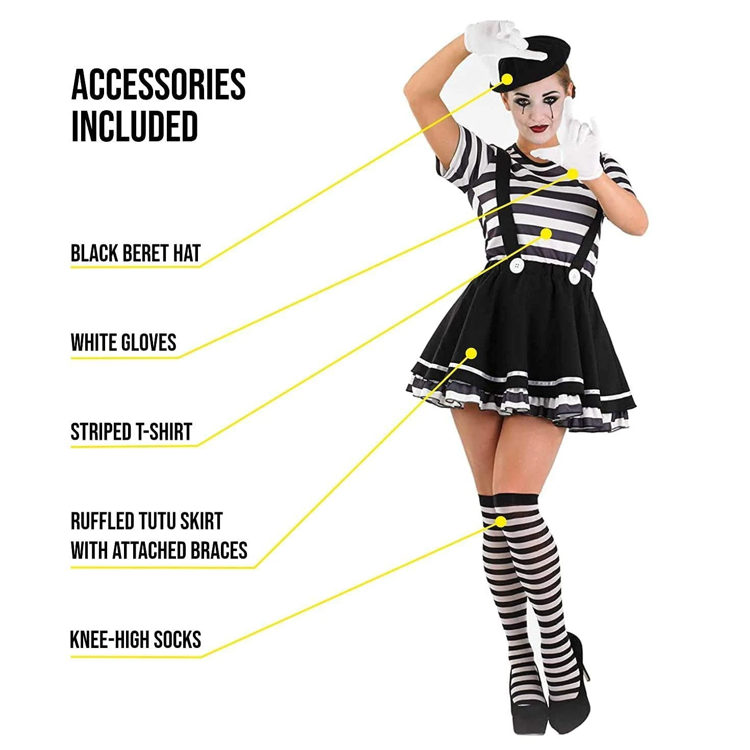 Il costume include: tutu gonna increspato con bretelle attaccate, maglia a righe, calzini al gionocchio, un cappello basco nero ed un paio di guanti bianchi.Questo costume per adulti è disponibile in taglia: S, M, L, XL. Usare l’immagine di riferimento per la misura delle taglie. Materiali di alta qualità, facile da indossare e resistente.La nostra Azienda è stata fondata nel 2009 da 3 amici appassionati di costumi. Abbiamo uffici in USA, UK ed Europa con centinaia di design che rispettano il massimo degli standard di qualità.