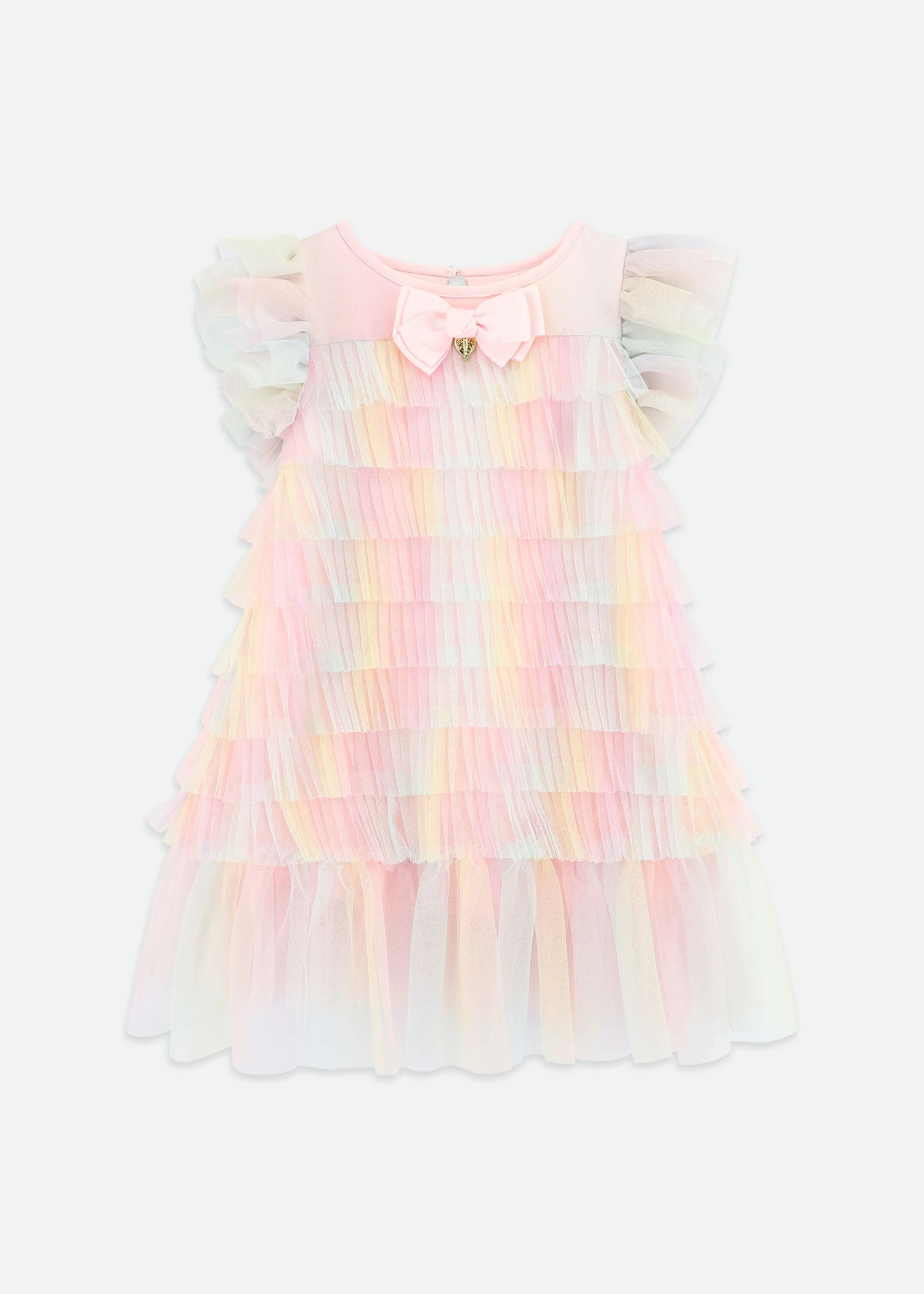 Beautiful dress for girls in rainbow. Featuring wonderful waterfall ruffles and tiers of tulle lined in soft material for extra comfort. The look is complete with our signature bow and gold heart charm in pink.