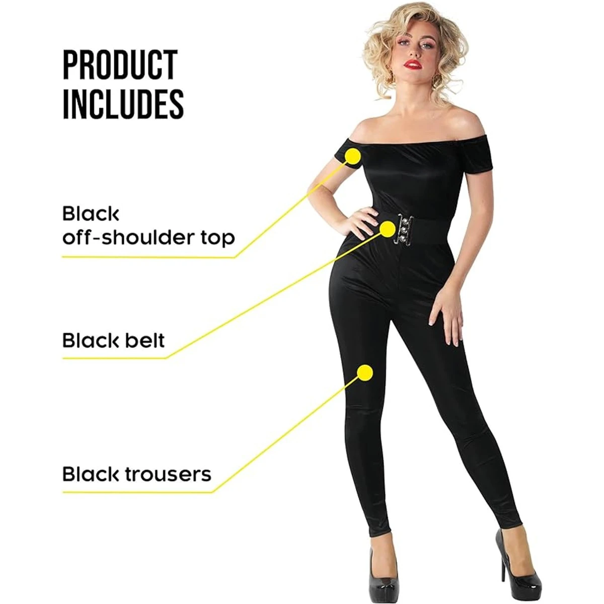 You’d better shape up when you pull on the women’s 50’s high school sweetheart fancy-dress costume for your next party. This outfit is perfect for a theme party and is inspired by summer loving, leather jackets and high school students being played by actors in their 40’s. The women’s 50’s sweetheart costume is perfect for hanging with the greasers and comes with a black catsuit that is actually a separate top and bottoms, joined by the belt in the middle.