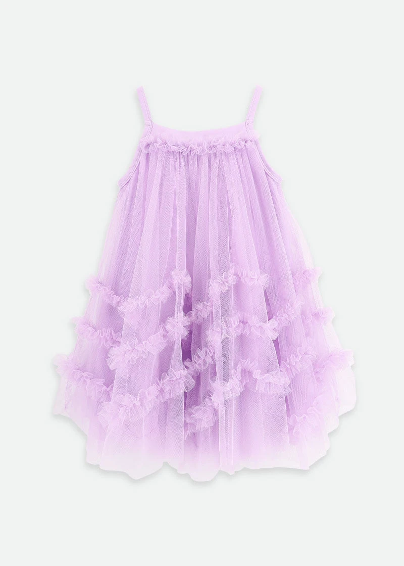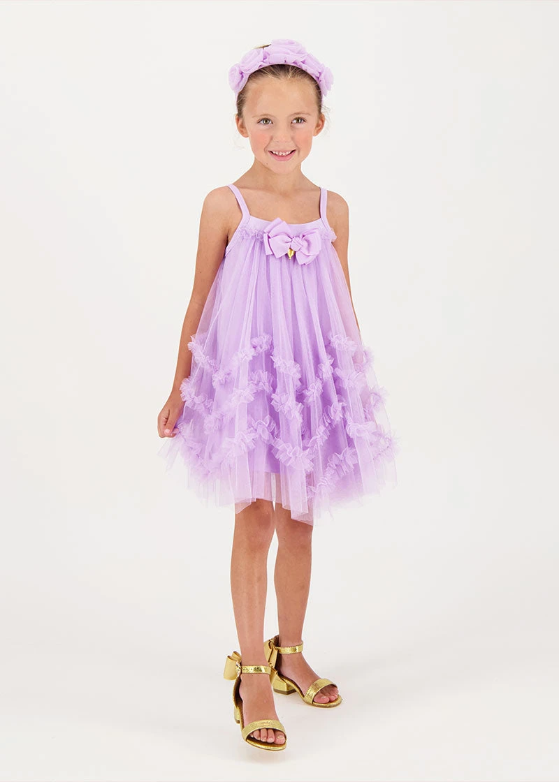 Adorable flowing dress in a lilac with layers of tulle. Featuring a voluminous skirt with a zig zag hem ruffle detail for extra flair. Completing the look with our signature bow and gold heart charm.